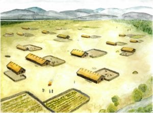 - Blick über die linienbandkeramische Siedlung von Stephansposching (Lkr. Deggendorf) mit rekonstruierten Häusern. Zeichnung: A. Pechtl.