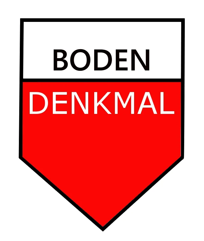 Die Trennung des Wortes Bodendenkmal in „BODEN“ und „DENKMAL“ unterstreicht die inhaltliche Eigenständigkeit der beiden Begriffe. Durch die Unterteilung in zwei Farbfelder wird der konservierend wirkende Pflughorizont und/oder Oberboden vom eigentlichen Denkmal getrennt. Der durch Pflugarbeit, Bautätgikeit und Raubgräberei ungestörte Boden ist somit Träger des Kulturgutes „Denkmal“. Diesen gilt es nachhaltig zu schützen und für die Zukunft zu bewahren. Hiefür steht auch die Warn- und Signalfarbe Rot.